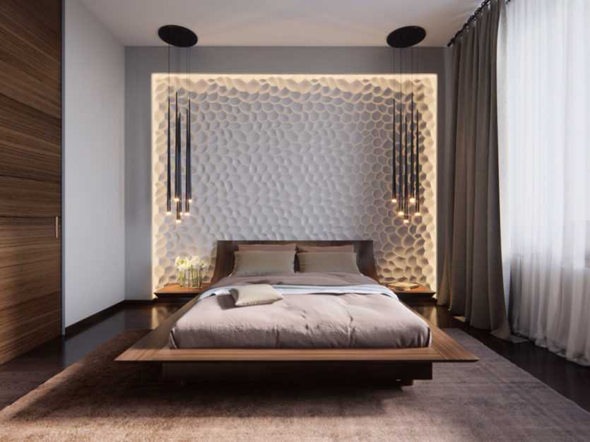 Объемными изображениями и орнаментами можно отделать одну из стен маленькой спальни. Это может быть изголовье кровати, стена за телевизором или произвольно выбранная область. Остальную часть спальни лучше отделать светлыми однотонными или с мелким невзрачным узором обоями.