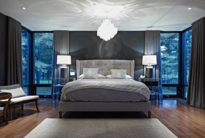 Для совмещения природы с техникой – плазма во всю стену спальни с картиной. Можно применить настенные фотообои 3D, наливные 3D полы.