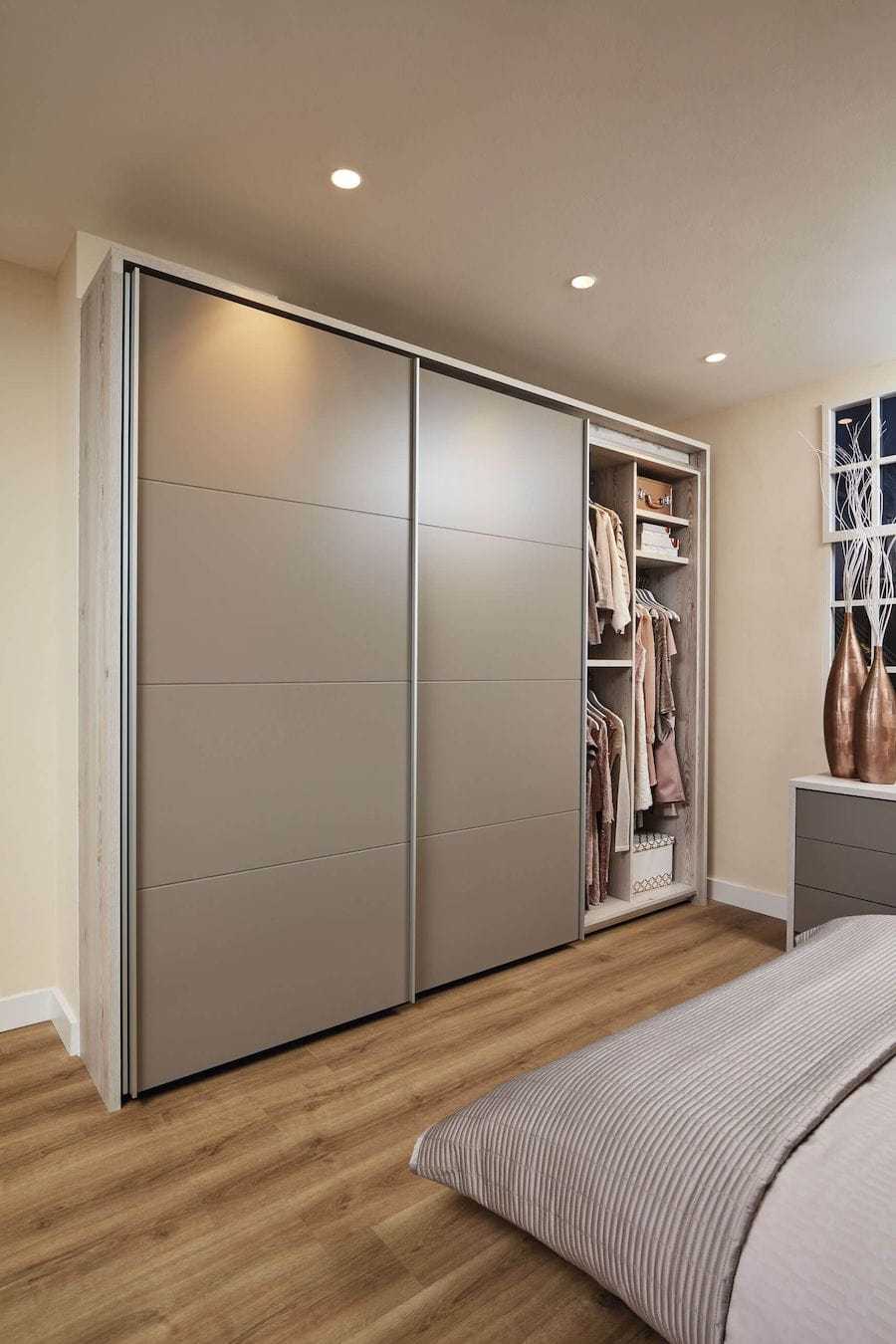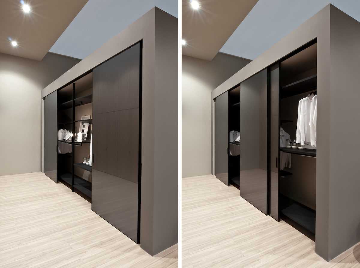Особенность дверей-купе в том, что они никогда не могут быть открыты полностью: сдвигая дверь от одной секции, вы неизбежно закрываете другую. Однако с дверьми-купе можно сделать шкаф под потолок — распашные двери в этом случае будут биться о люстру.