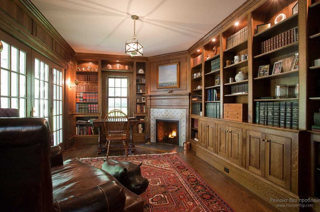 Книжные полки могут украшаться личными вещами или различными сувенирами и декоративными тарелками. Кстати, имеет смысл ими разбавить ряды с книгами. В таком случае, если будет необходимо расширение книжной коллекции, место для новых экземпляров у вас уже будет уготовано. Относительно стола – для гостиной чудесно подойдет журнальный столик вместо письменного, который уместен в кабинете. Также помимо этого, можно разместить плазменный телевизор, диван с пуфиком – все на ваше рассмотрение. В качестве аксессуаров прекрасно подойдут картины или декоративные вазоны с красивыми цветами. Всегда уместен будет и уютный камин в гостиной. Очень хорошо смягчить пространство при помощи удобных сидячих мест, а также, ковров.