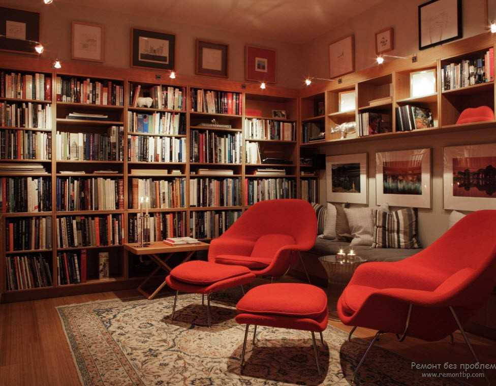 При обустройстве домашней библиотеки, в частности – читальной зоны, важным моментом является правильная организация света. Книгам слишком яркий электрический свет вреден. Шкафы, полочки лучше оставить без лишнего освещения. Достаточно одной потолочной люстры. Днем стеллажи с книгами нужно защищать от естественного света. Эту функцию хорошо выполнят обычные жалюзи.