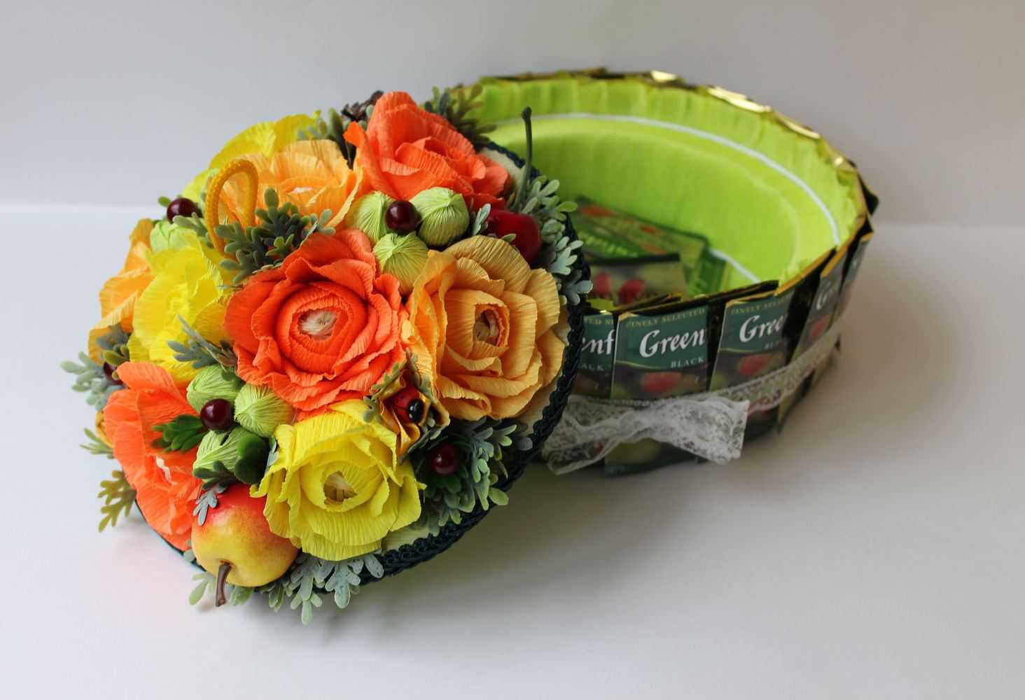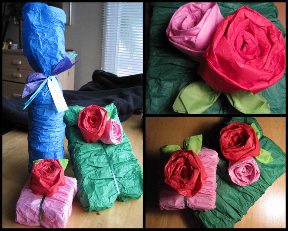 Но если нет возможности и финансов для приобретения живых цветов, то обрамление для шампанского или вина делают из бумажных роз и тюльпанов. Цветы создают из гофрированной или крепированной бумаги. Внутрь цветка закладывают шоколадную конфетку.