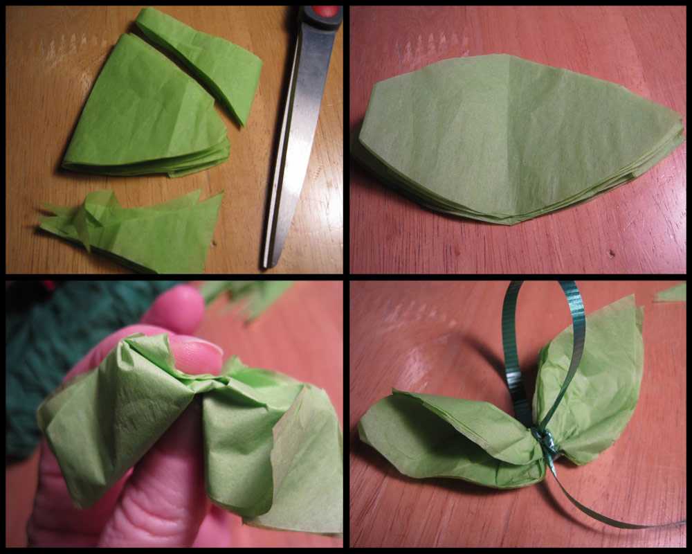 - Из зеленого крепа вырезают листочки.