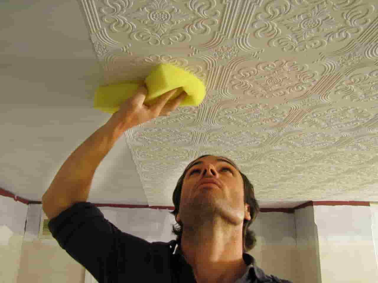 Совет! Не стоит мочить весь потолок, пока вы будете работать на одном участке, остальная поверхность высохнет, и вам придется повторять операцию несколько раз.