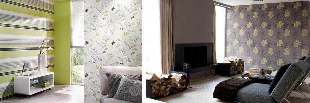 Если зал прямоугольный, визуально расширить площадь можно при горизонтальном сочетании орнамента. Вертикальное комбинирование позволяет «вытянуть» гостиную с низким потолком.