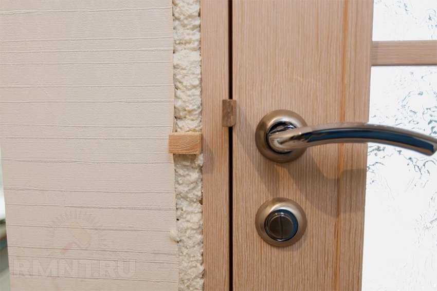 После закрепления коробка должна быть отрегулирована на предмет изгибов, затем технологический шов заполняется монтажной пеной с обратной от откоса стороны. Дверь после заполнения шва необходимо держать закрытой около 40 мин, проложив по притвору дистанционные пластины. После полимеризации пены регулировочные клинья нужно удалить и запенить образованные полости.