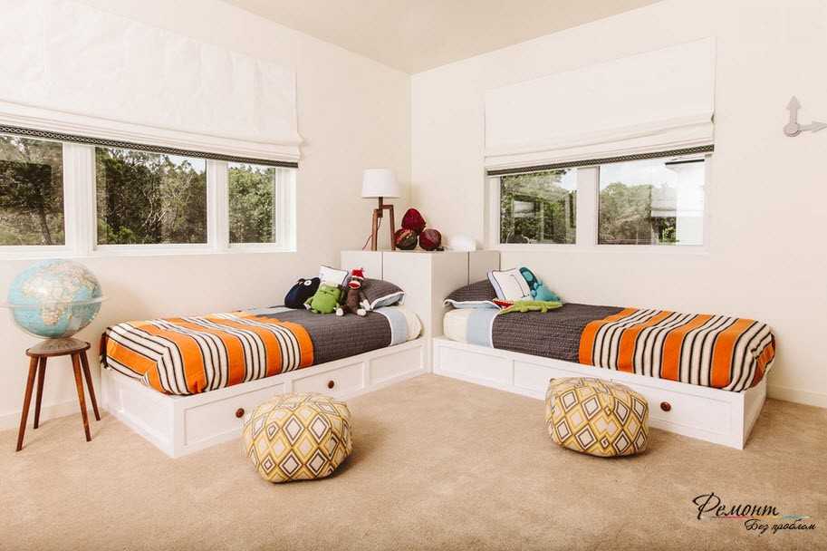 Купите или сделайте своими руками угловой блок с двумя односпальными кроватями с ящиками для хранения. С этой конструкцией вы сможете получить такое же количество место для хранения — и две большие кровати. Это представляет собой единый блок в форме буквы «Г», который красиво вписывается в угол. Этот вариант позволит каждому человеку в комнате иметь собственное пространство и место для хранения внизу. Преимущество таких кровати заключается в том, что они позволяют максимально использовать пространство в даже самой небольшой комнате. К тому же эта конфигурация даст вам большую свободную площадь пола, ведь мебель будет придвинута вплотную к стене.