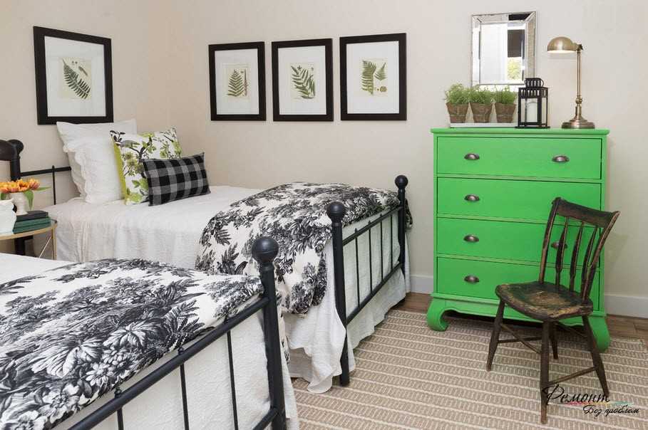 Для экономии пространства кровати можно поставить впритык к противоположным стенам, а между ними вместить комод, шкаф или этажерку для личных вещей.