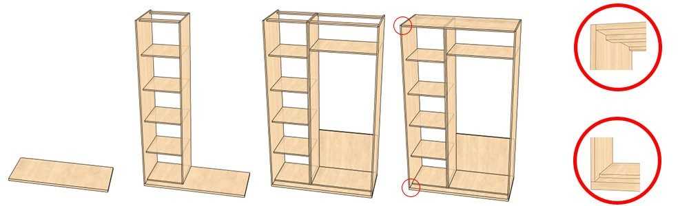 Примерная схема сборки шкафа-купе представлена на фото ниже. Все детали должны быть закромлены, а также проведены все присадочные работы. Чтобы шкаф, своими руками собранный и установленный, отличался высоким качеством, лучше производить данные работы на специализированных станках.