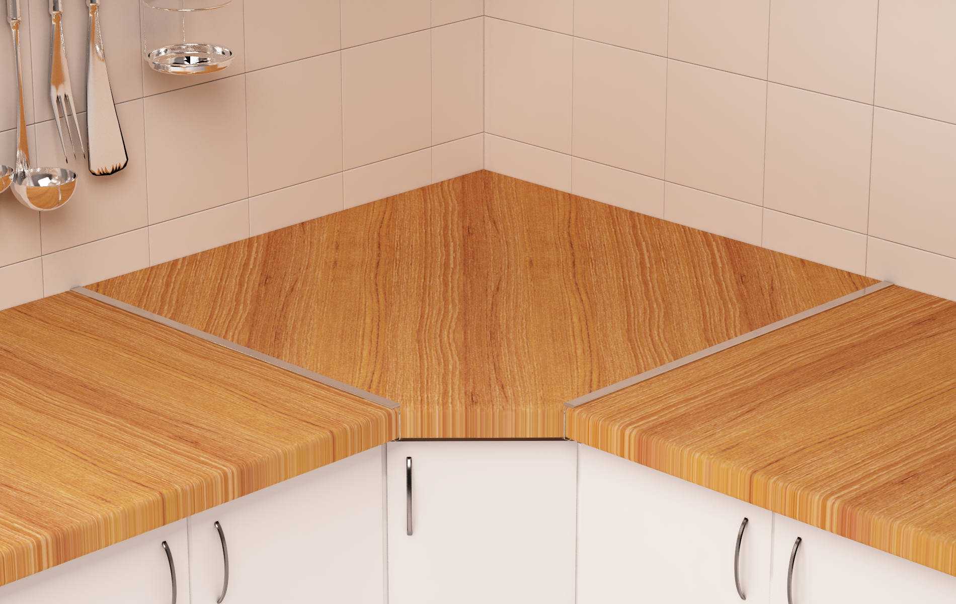 Но есть у этих двух видов соединения несколько недостатков. Так как еврозапил – это замковое соединение, то разворачивать части плоскости относительно друг друга нельзя – прервётся целостность конструкции и образуется зазор между частями. Поэтому если углы на кухне неровные, то при установке кухонного гарнитура в углу помещения останется зазор между стеной и столешницей. Если постараться закрыть зазор, сдвинув плоскость, то появится щель между частями столешницы. Можно скрыть зазор у стены настольным мебельным плинтусом. Но если кривизна угла большая, то и это приспособление не поможет.