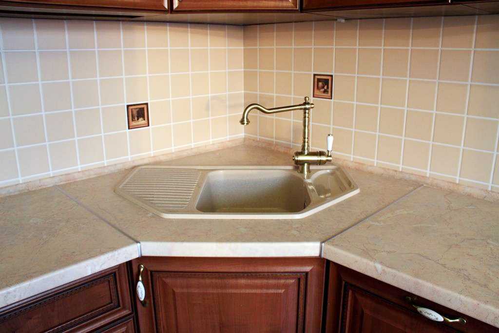 Оптимальным решением будет сбор трапеции из стандартных плит шириной шестьдесят сантиметров. Стоит учитывать, что в этом случае возле стены получится некрасивый стык. Создать удобную столешницу без швов можно, если установить элемент к стене на пару сантиметров выше рабочей плоскости. Таким образом удастся избежать подобной проблемы. Полученная полочка послужит местом для размещения на ней моющих средств или других предметов.