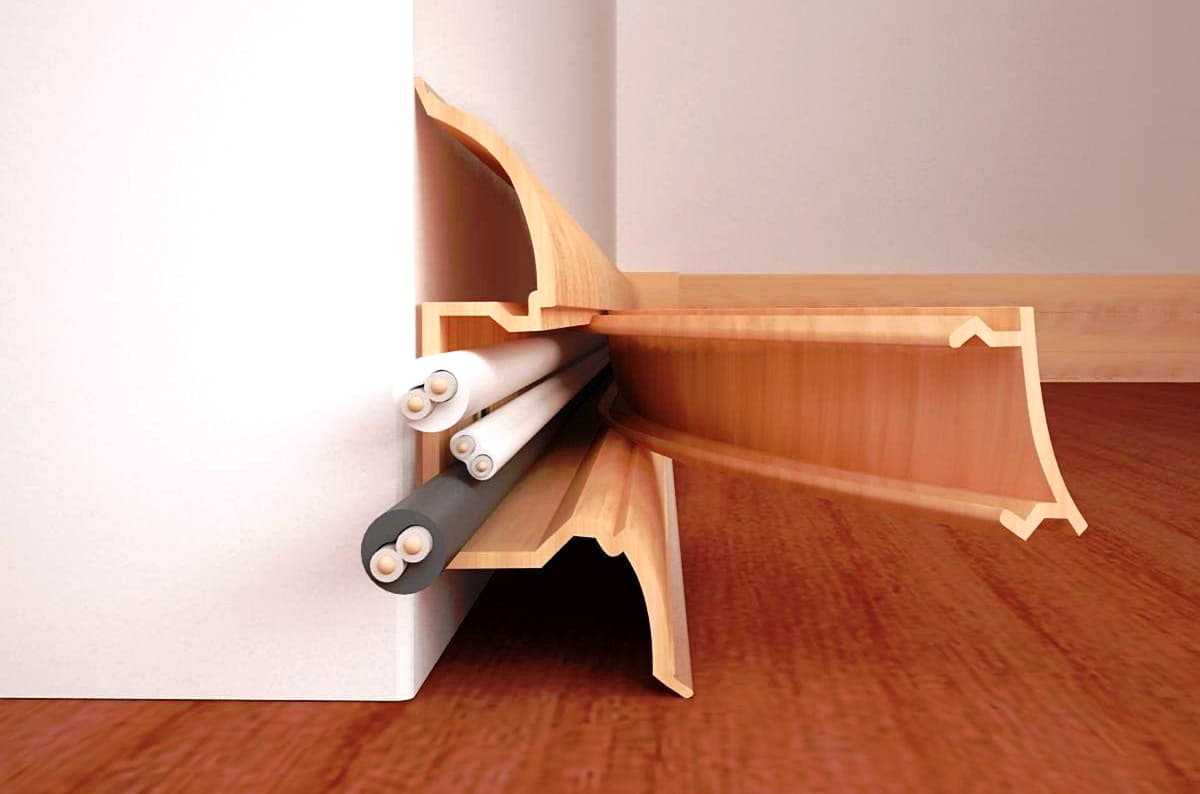 В магазинах представлен широкий ассортимент плинтусов для пола с отверстием для проводов (с кабель-каналом). Центральная часть такого плинтуса снимается, в нишу укладываются кабели, после съемный элемент возвращается на место. Работать с подобными плинтусами удобно, быстро, отсутствует пыль, грязь, не портится напольный материал.