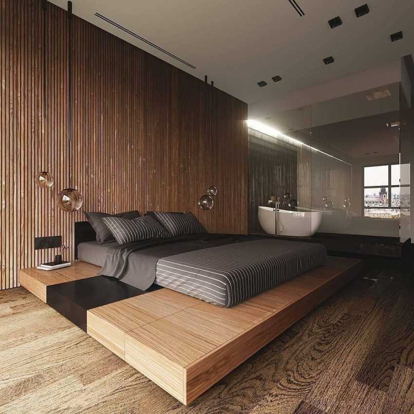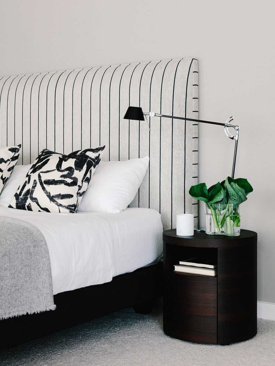 Изголовье часто делают мягким, а вокруг кровати создают целый «ансамбль», состоящий из тумбочек, светильников над ними, банкетки в изножье, полога и подзора.
