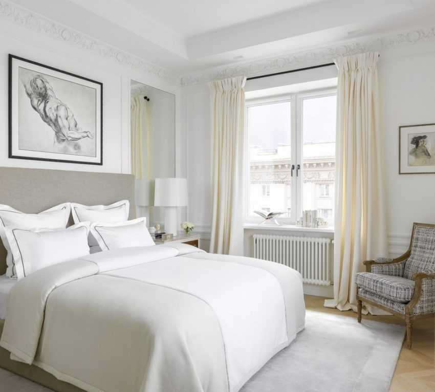 Для большой спальни можно применить как тяжелые портьеры, украшенные пышными складками, так и легкие занавески, придающие комнате воздушность и ощущение простора.