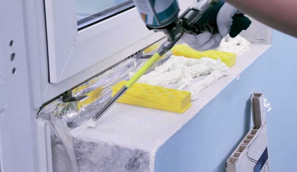 - Пустоты между опорами обычно устраняют. Для этого используют монтажную пену или минеральную вату. Во втором случае подложки должны прочно сцепляться с основанием оконного проёма, поэтому опоры фиксируют силиконовым клеем. Перед использованием этого материала поверхность рекомендуется обезжирить.