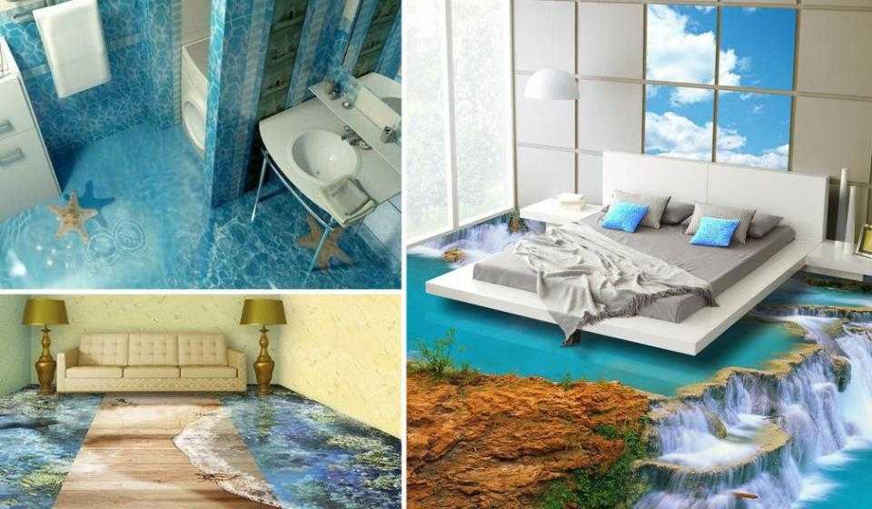 Довольно популярным, но до сих пор ещё не самым доступным трендом, является наливной 3D пол. Вот тут действительно простор для фантазии, ведь плёнка с фотопечатью, которая и создаёт 3d эффект «рисуется» под заказ, и хотя в конторе обязательно будет каталог готовых решений, но следовать ему необязательно. При желании вы можете разместить у себя на полу хоть живой портрет Адольфа Гитлера и каждый день топтать его ногами. А уж золотой песок или водную гладь, со стайками рыбок, да ещё и в ванной комнате, сам бог велел.