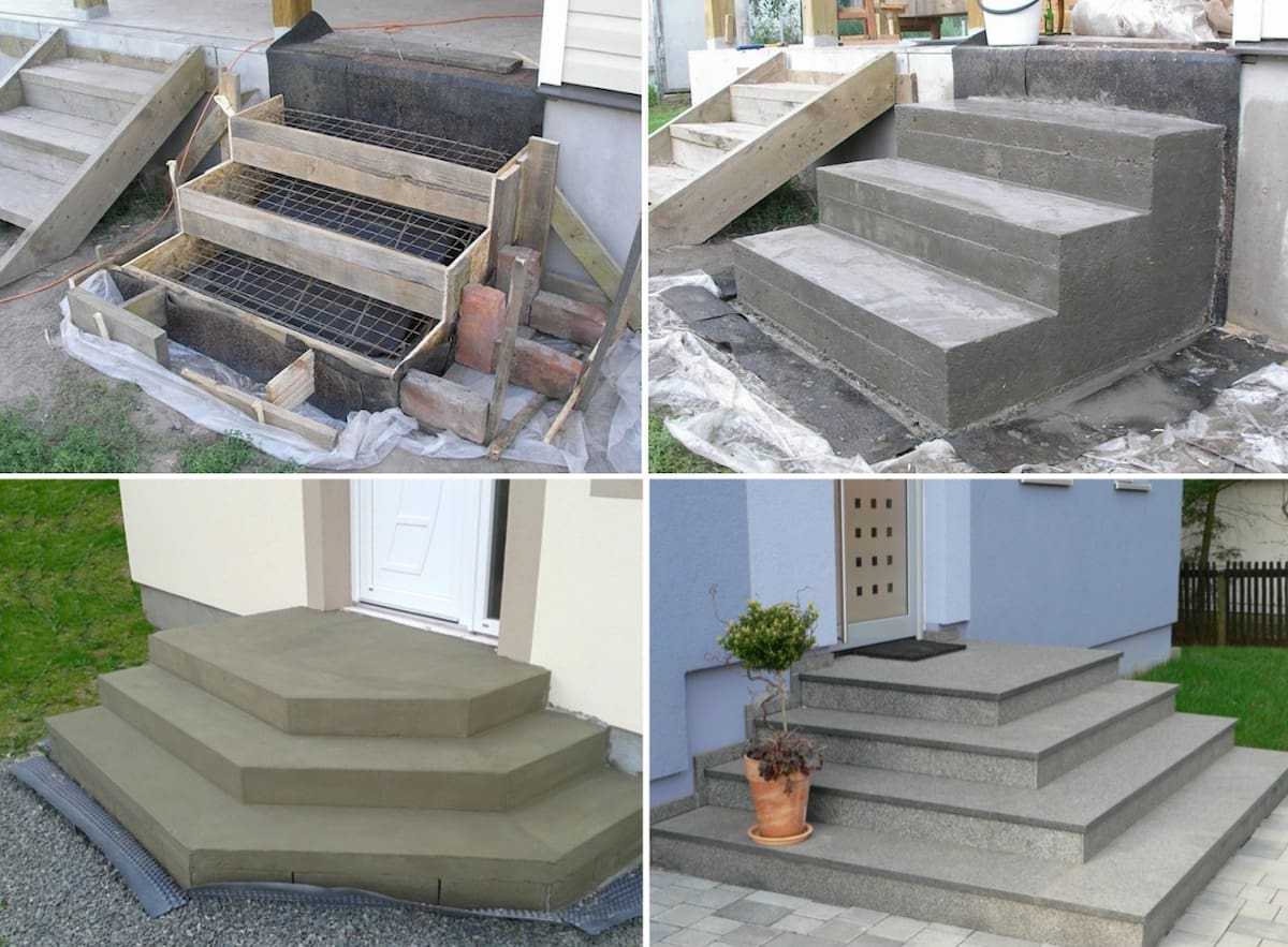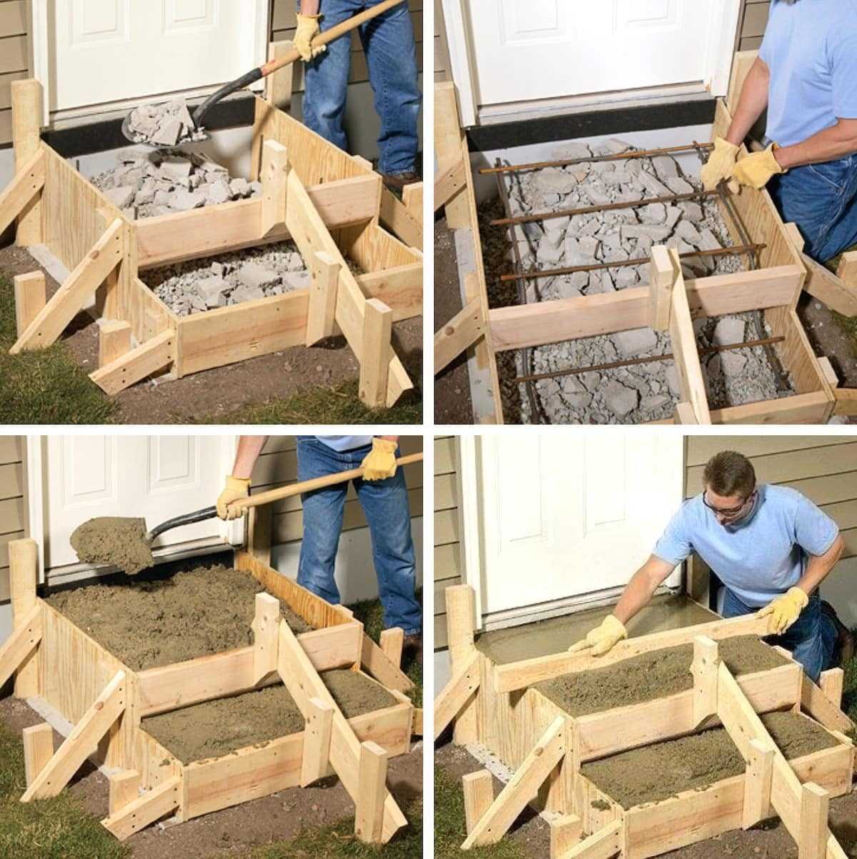 На фото показано как правильно из фанеры и досок собирать опалубку для крыльца