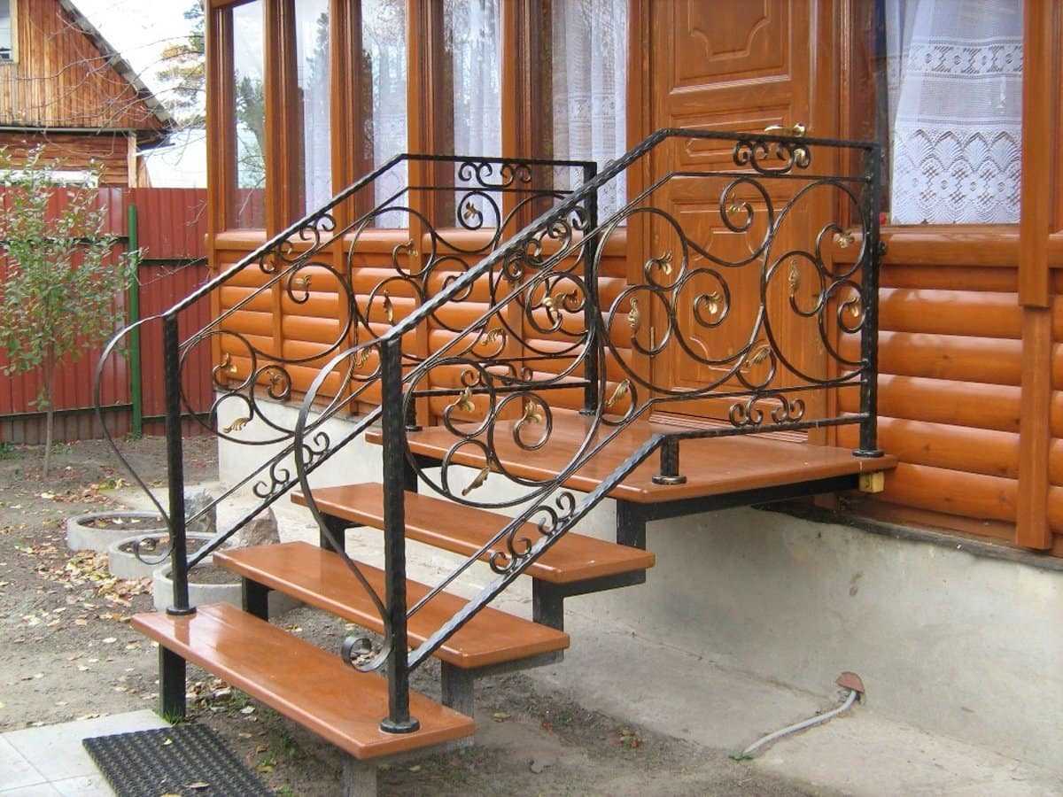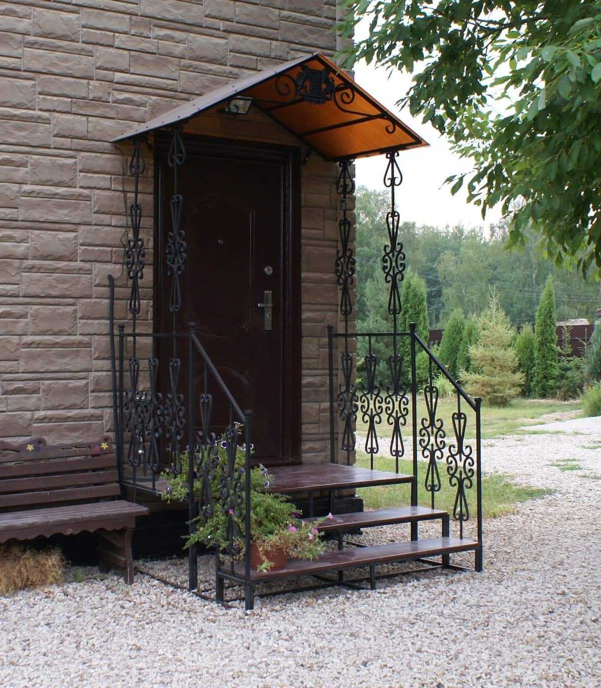 Перила устанавливаем по желанию. Высота поручней – от 90 см. Можете использовать следующий вариант. Он же подойдет для металлического и деревянного крыльца (в этом случае мы заменим металлические элементы деревянными).