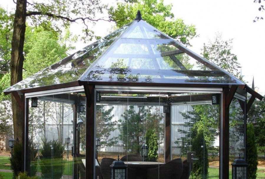 Чтобы решить вопрос духоты внутри, можно выполнить конструкцию крытого типа с использованием стеклянных штор. Конечно, такие сооружения не будут теплыми, как беседки из камня или кирпича, однако, для теплых регионов они вполне подойдут. К тому же открытие стеклянной двери-шторы позволяет при необходимости сделать из закрытой беседки аналог полузакрытого типа. Такая беседка будет светлой, а если оклеить стекла специальной пленкой, она будет защищена от радиации и скроет от любопытных глаз все, что происходит внутри. При этом пленка весьма уникальная: изнутри вид на улицу не будет ограничен.