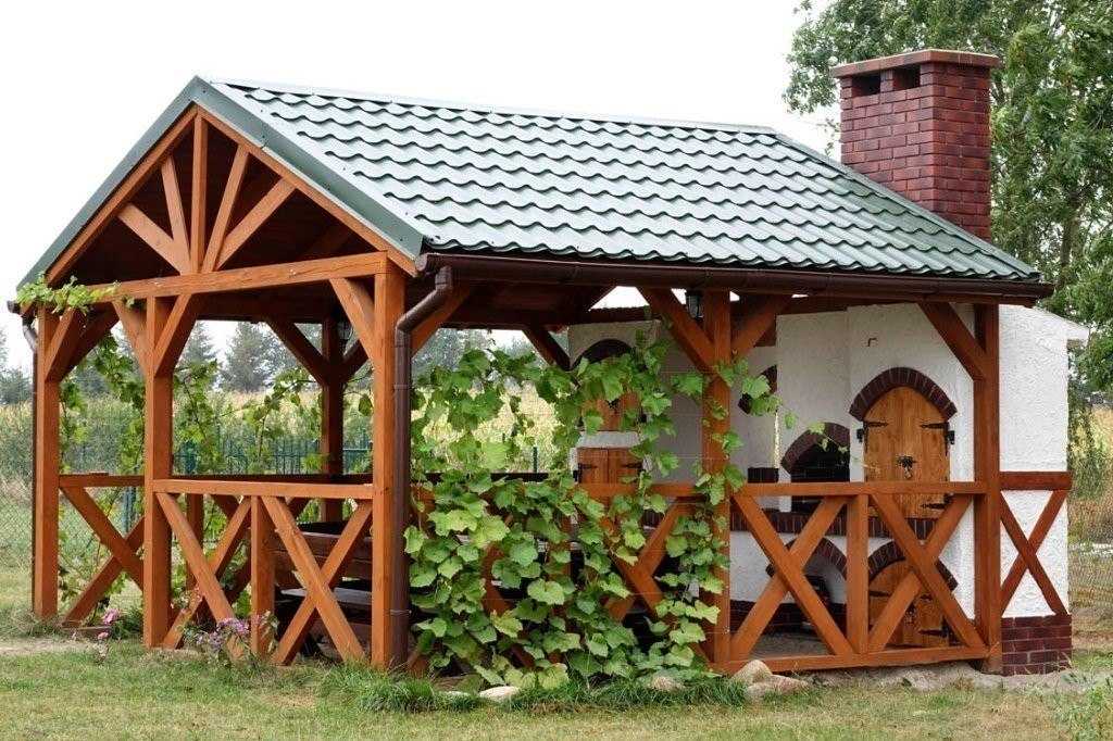 Главным предназначением такого вида постройки является приготовление барбекю и шашлыков. Они имеют соответствующее обустройство и оснащены мангалом. Материалы должны быть практичными, легкгоочищающимися, стойкими к условиям эксплуатации: металл, дерево или камень.