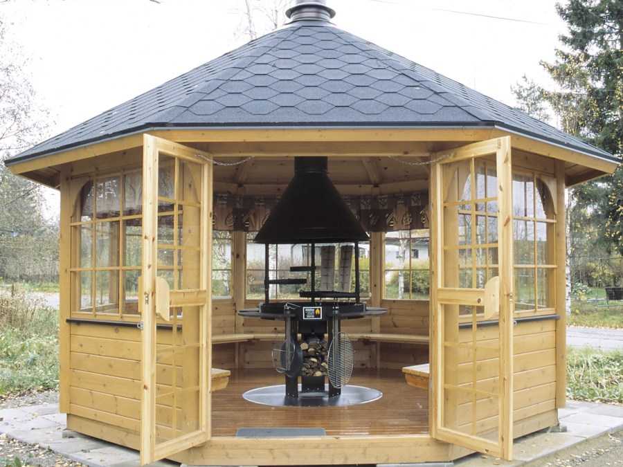- финская беседка под барбекю, или гриль-домик, — шестигранный застекленный дом с двустворчатой застекленной дверью, по периметру оборудована лавка, а в центре расположен гриль с выведенной на крышу трубой;