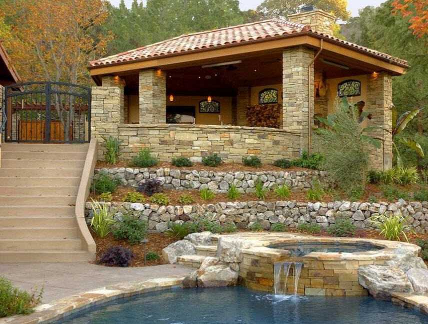 - Каменный павильон еще должен гармонировать с другими постройками. Если дерево впишется практически в любой экстерьер, то с массивными материалами не все так просто.