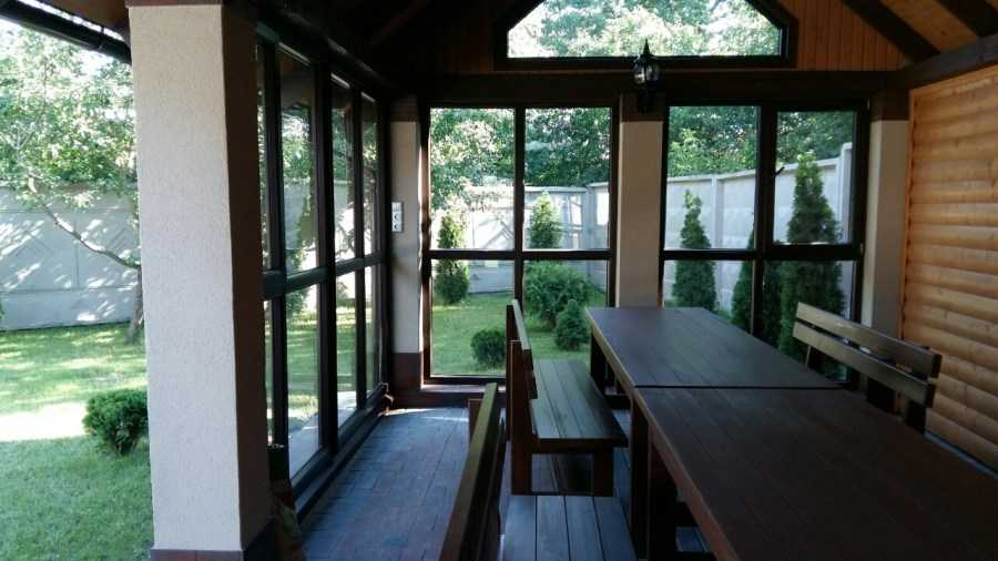 - Летний вариант закрытой беседки: с панорамными раздвижными окнами. По сути, стеклопакеты представляют собой стены, которые легко открываются в погожий день. А когда на улице дождь или ветер — окна задвигаются и пространство становится замкнутым.