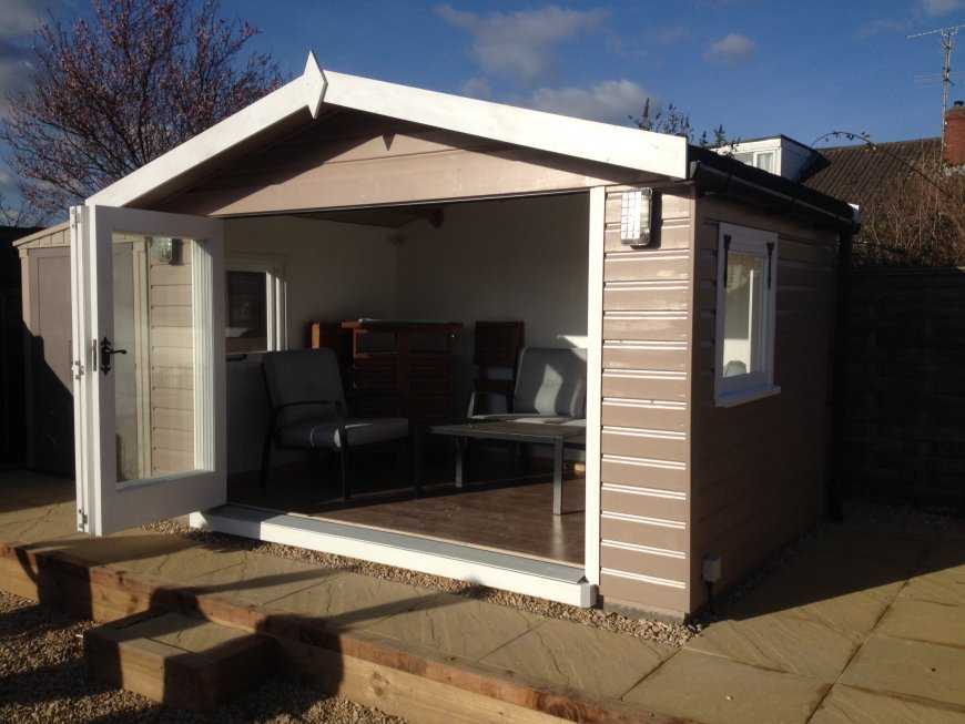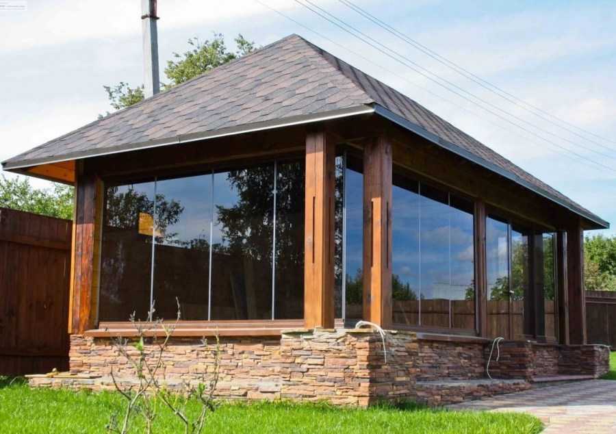 Стиль сооружения может быть любым, как и материал. Форма такого типа беседки чаще всего прямоугольная или многогранная. По стилевому решению конструкция должна соответствовать дому и пейзажу. Главное то, что минимум две стенки должны открываться. При условии утепления такая беседка предусматривает возможность использования в зимний период.