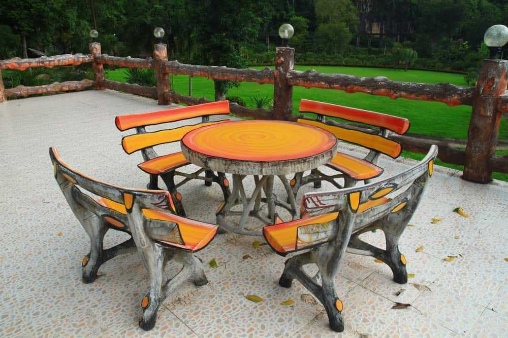 - Дачный комплект мебели может быть сделан из камня. Внешне такие изделия выглядят необычно, характеризуются множеством достоинств — это долговечная, прочная, водонепроницаемая, экологически чистая мебель, к тому же она совсем неприхотлива в уходе. Вместе с тем такие конструкции очень тяжелые, перенести их на другое место практически невозможно, поэтому чаще всего камень комбинируется с другими материалами, в основном деревом.