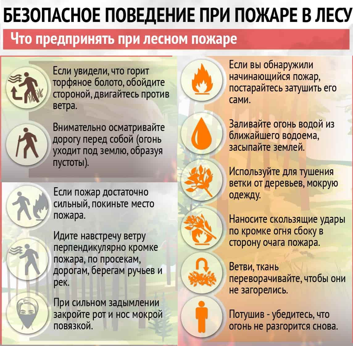 Помните, что возгорание деревьев и растительности сопровождается густой и токсичной задымленностью. Обязательно намочите любую ткань водой и прикройте органы дыхания. Если Вы находились в лесу с группой, то следует держаться вместе.