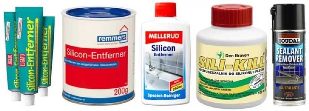 В настоящее время на прилавках магазинов можно видеть различные средства, которые позволяют размягчить и смыть герметик на основе силикона. Они позволяют удалять клей с различных поверхностей, однако при их выборе нужно внимательно ознакомиться с инструкцией, чтобы потом при использовании не нанести повреждения обрабатываемой поверхности. Чаще всего используют следующие средства: