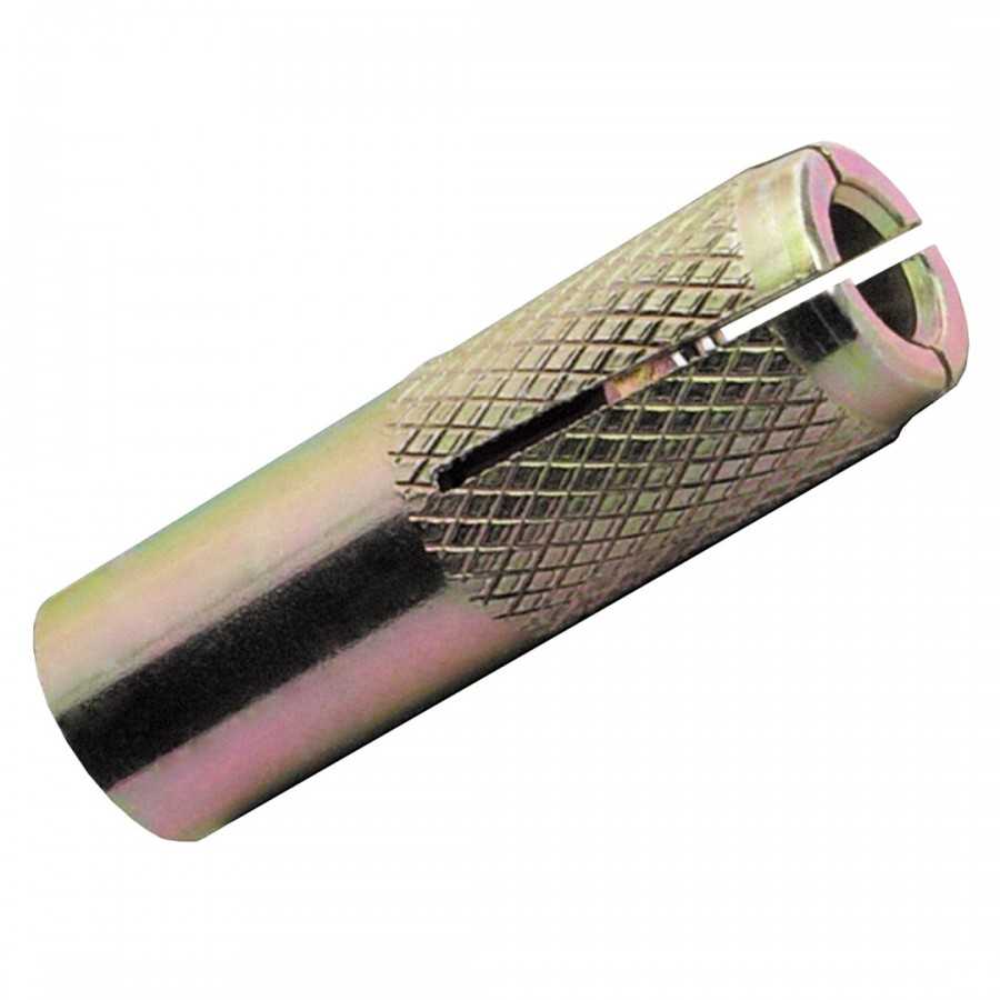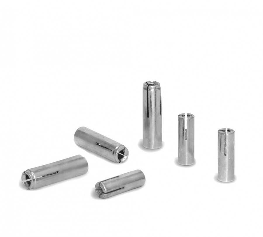 Дюбель для шлакоблока может представлять собой металлическую гильзу распорного типа с маркировкой GB, на которой есть крупная или мелкая резьба, как это показано на верхней фотографии. Именно такая винтообразная конструкция позволяет дюбелию после расширения (после вкручивания болта или шурупа) плотно удерживаться в пеноблоке. Тем не менее, подобное устройство отлично подходит для горизонтальной фиксации, например, данный крепеж как нельзя лучше применим для мауэрлата или для дощатого пола, если его стелют по пеноблокам, выставленным по периметру. Но, к сожалению, металлические дюбели с резьбой некорректно ведут себя на вертикальной плоскости, где крепеж делается «на оттяжку».