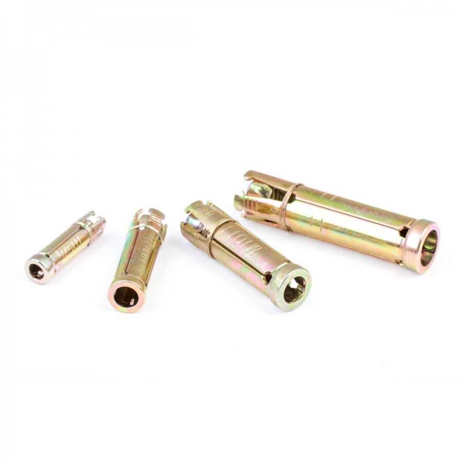 Забивной анкер состоит из распорной части (гильзы), болта и гайки. Распорную часть забивают в подготовленное отверстие. Болт вкручивают в распорную часть вместе с гайкой, затем гайку снимают. Такое монтажное крепежное изделие применяют для последующего привинчивания с помощью гайки петель или уголков. На них можно подвешивать полки, карнизы и др.