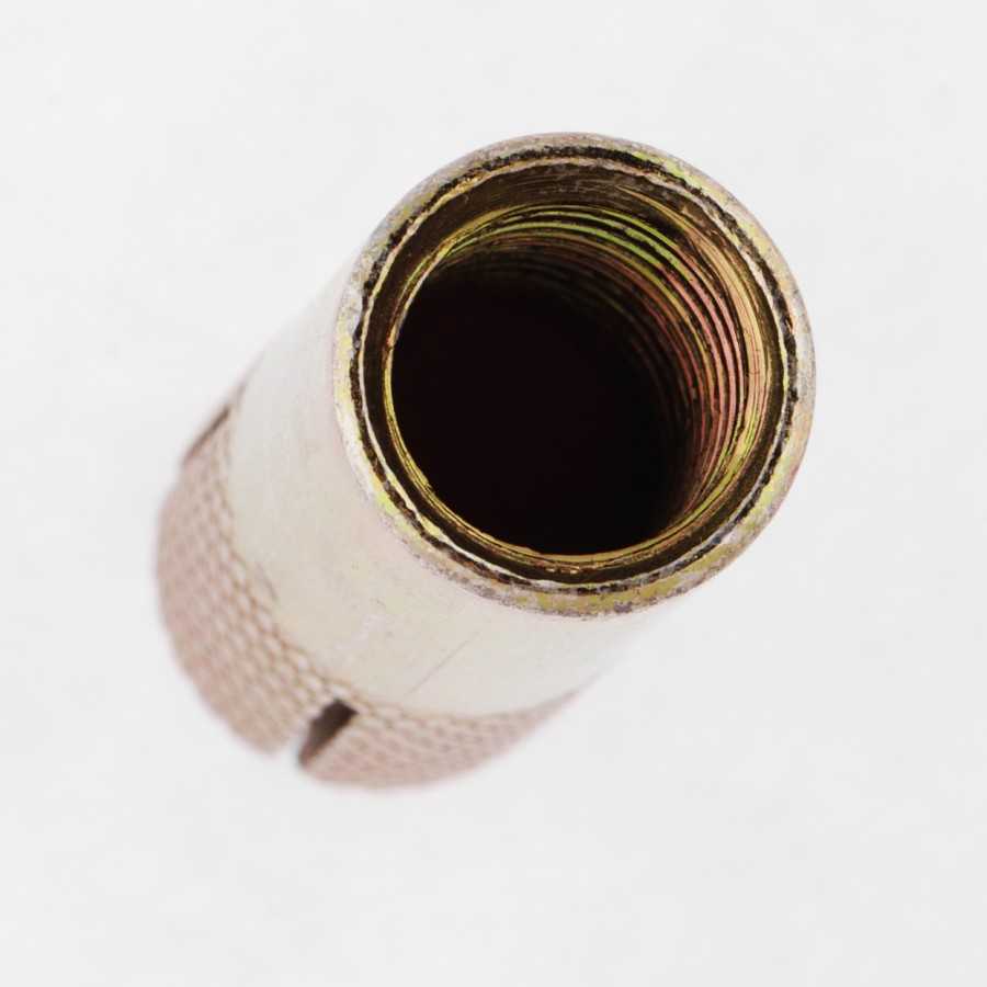Анкер двойного распирания состоит из шпильки с двумя распорами и гильзы с разрезами посередине и на конце. Благодаря двум распорам крепление выходит более прочным. Его используют при монтаже на стену из пустотелого кирпича, когда нужна большая устойчивость к вырыванию.
