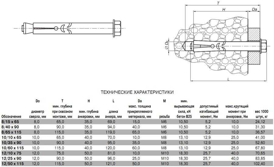 Все технические характеристики анкеров указываются в таблице, это могут быть вес, максимальный крутящий и допустимый изгибающий момент, минимальная вырывающая сила, оптимальные нагрузки, расстояние между осями и до края и т.д. В соответствии со всеми этими параметрами выбирают подходящие изделия и выполняют качественное крепление к бетону анкерами.