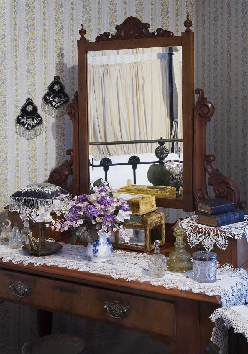 A nineteenth (XIX) century (1800s) bedroom with a vanity mirror and personal hygiene paraphernalia .Auckland, New Zealand