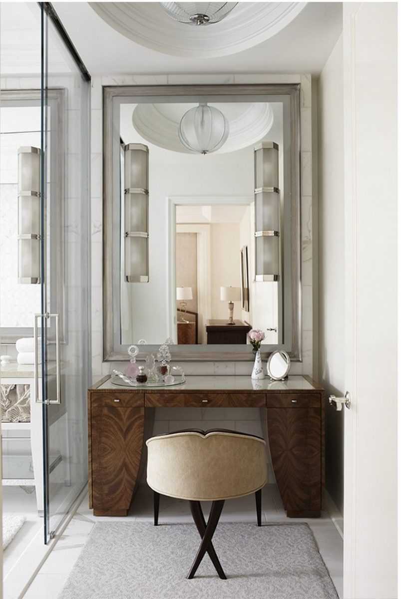 Дамы предпочитают обустраивать в спальне гардеробные с большими зеркалами, если позволяет площадь помещения, или останавливаются на туалетном столике с симпатичным пуфиком.