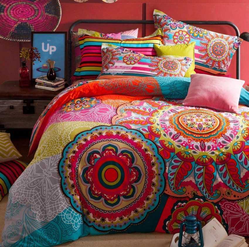 Обилие броских подушечек с вензелями, милых сердечек и пледов, нестандартных прикроватных светильников дарит праздничную жизнерадостную энергетику. Фоновая красная яркая стена в спальне создаёт удачный тандем с чёрным изголовьем постели, не делая обстановку кричащей. Ложе может быть круглого типа, находясь под балдахином, а узорчатыми коврами будет подчёркнута восточная стилизация.