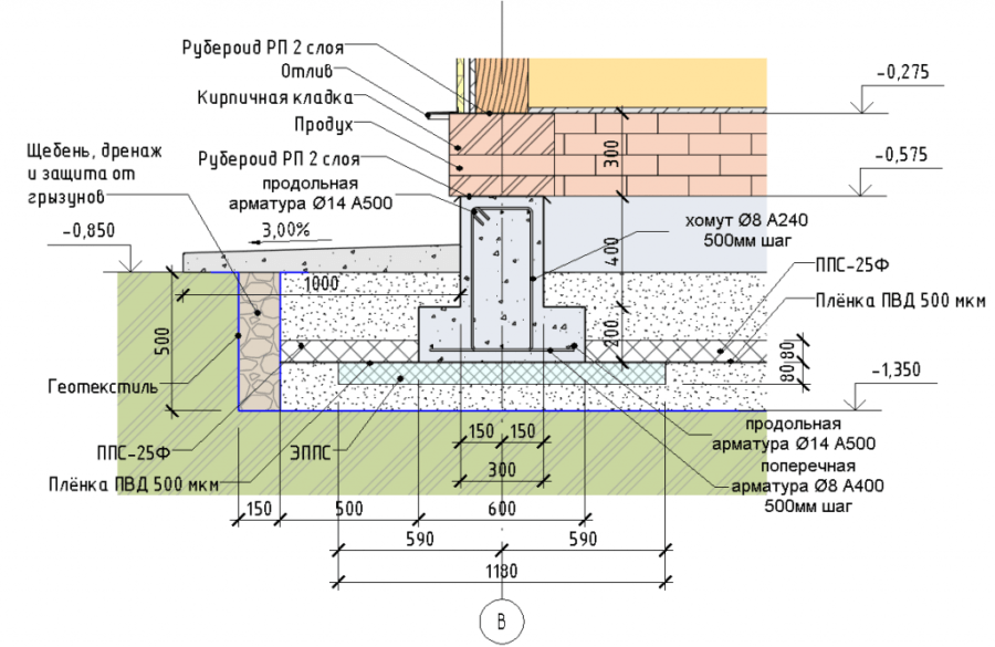 Типовая конструкция МЗЛФ — мелкозаглубленного ленточного фундамента