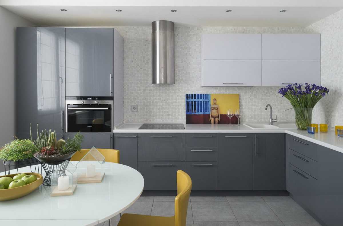 Современный, с его сугубой функциональностью и технологичностью – серо- или черно-белые оттенки гаммы, с грилем и фритюрницей, вытяжкой, посудомойкой и шкафом для подогрева посуды, выполненными в металле или близких по тонам материалах.