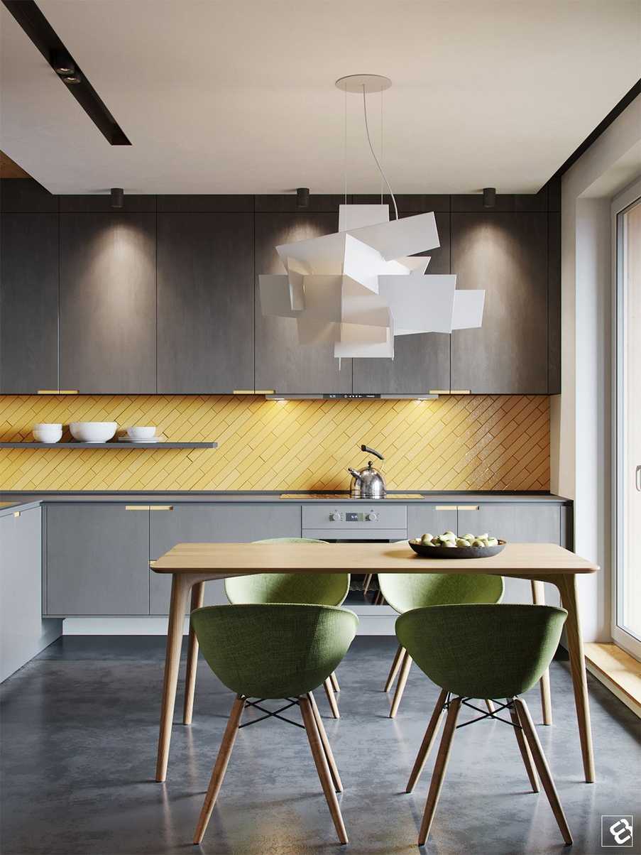 5. Серый с зеленым. Вся зеленая палитра благоприятно действует на психику человека. Хотите оформить интерьер в стиле эко? Используйте серые и зеленые цвета. В дизайн можно гармонично вписать натуральные материалы в качестве акцентов. Это может быть столешница, фартук, часть фасадов.