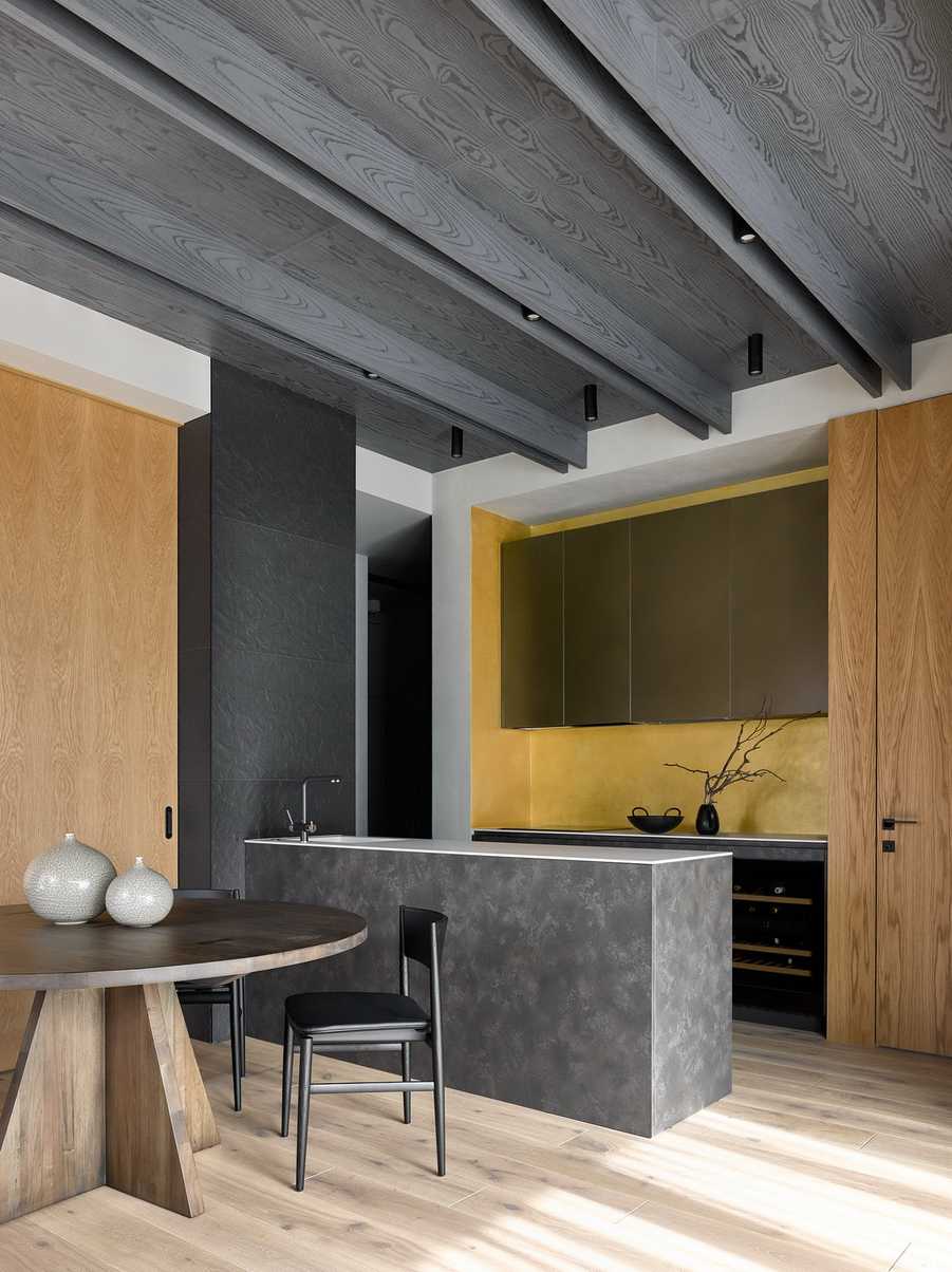Современные кухни в монохроме представлены темными тонами. В тренде темная кухонная мебель и отделка в черном цвете. Разбить довольно мрачный интерьер позволяет выбор светлых рабочих поверхностей и кухонного фартука.