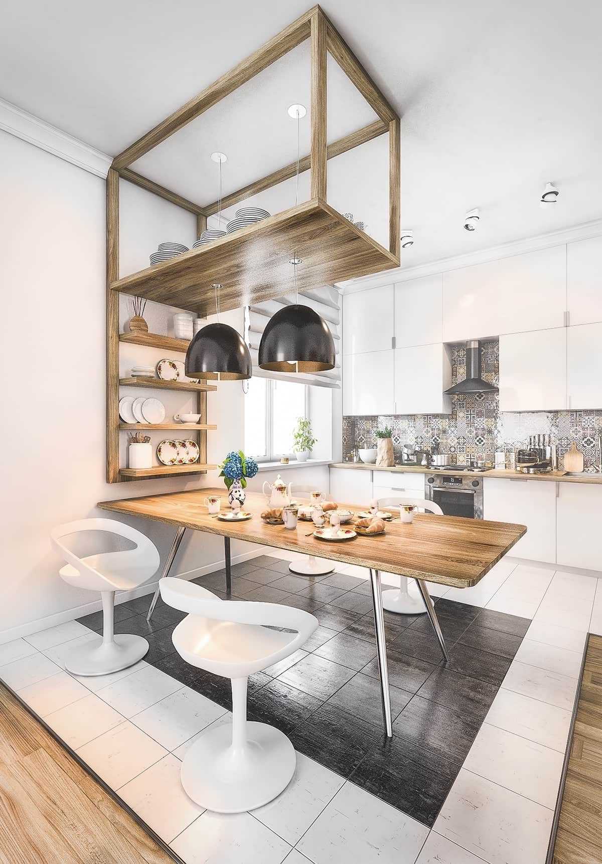 Если тебе нужен полноценный обеденный стол, эффектно смотрится массивное дерево на контрасте с воздушной белой кухней. Или наоборот – маленький ажурный круглый столик, в лучших традициях французских кофеен. А может тебе хватит барной стойки, которую можно совместить с гарнитуром и дополнить эффектными высокими табуретами?