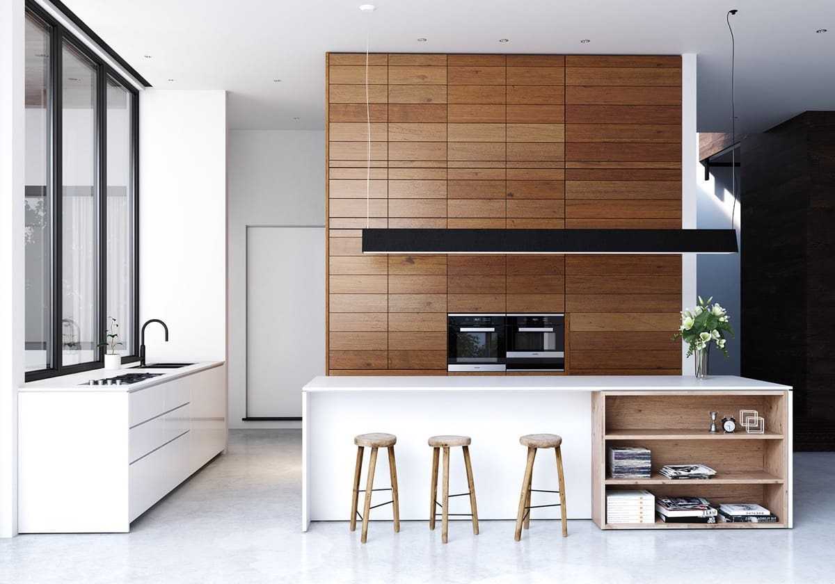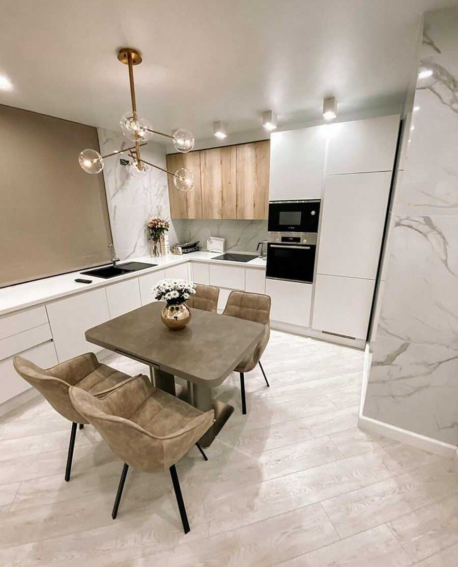 В минимализме царит лаконичность и функциональность. Встроенная техника и освещение, отсутствие мелких деталей в интерьере, бесшовная отделка и футуристическая мебель, крупные акцентные стены, вставки из натуральных камней, декоративные панели под дерево или кирпич – все это характеризует этот стиль. Он подойдет для совмещенных кухонь с гостиными любой площади. Особенно любят такой вариант путешественники и семьи с детьми – ровные поверхности занимают меньше времени на уборку.