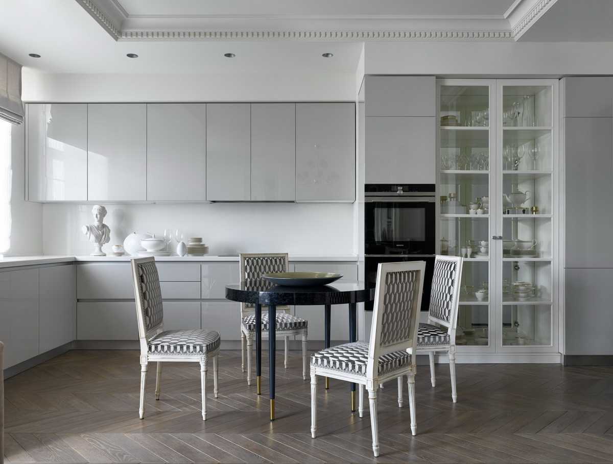 Неоклассика с ее пастельными оттенками и деревянной мебелью идеально подойдет для создания модного кухонного интерьера. В распоряжении дизайнера – стекло, раздвижные двери, окна с расстекловкой, фотографии и эстампы в деревянных рамках.