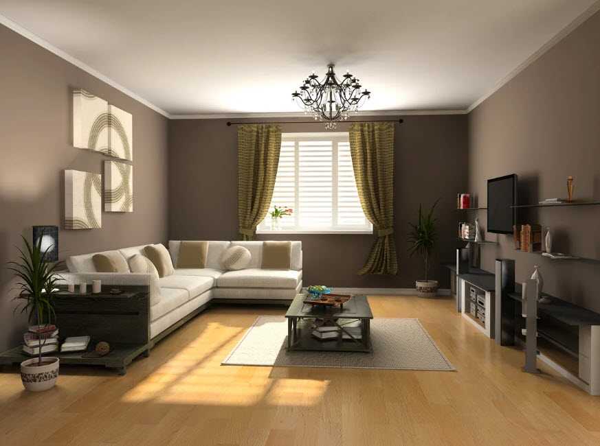 Цветовую основу интерьера задают самые большие объекты в комнате — стены, пол, диван, гарнитур. Допускается выбор двух близких оттенков (более светлый и более темный). Затем выбираются 2-3 дополнительных оттенка, которые сочетаются с основным цветом или, наоборот контрастируют с ним.