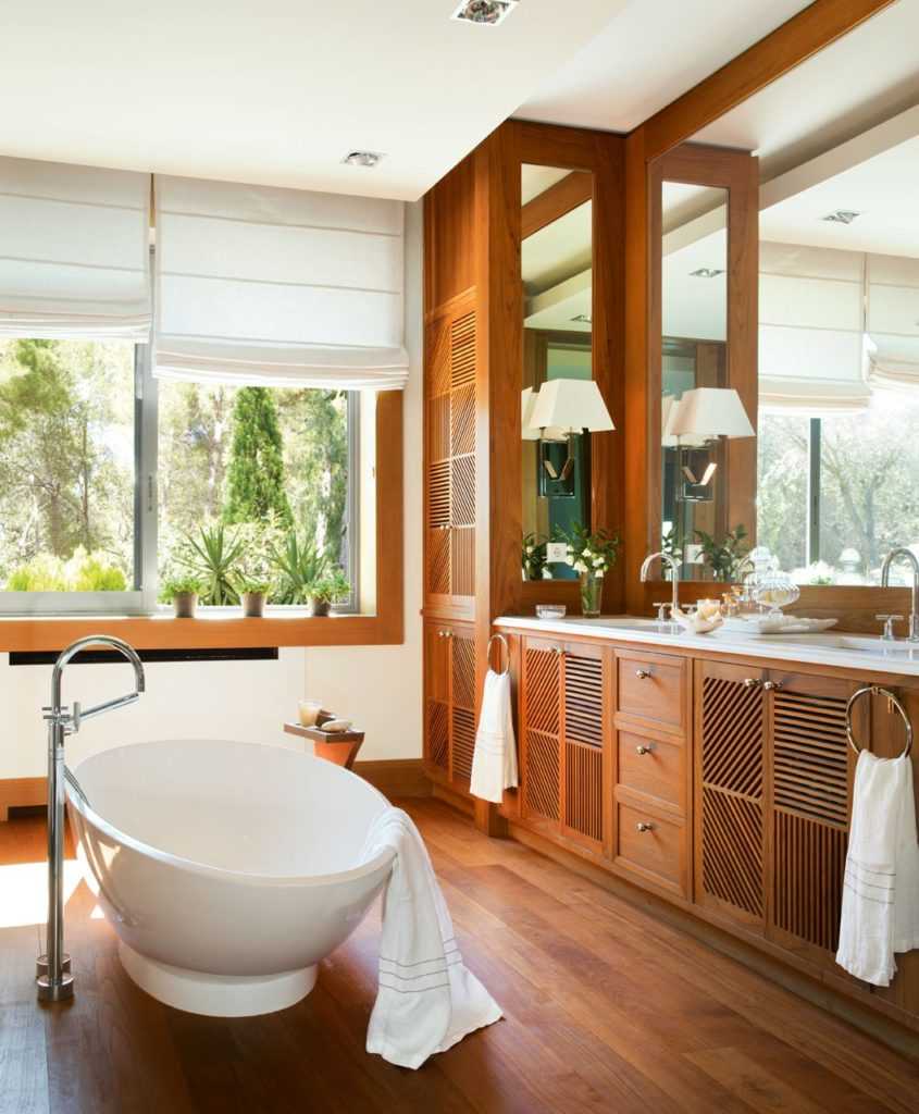 Если вы ищете интересные идеи для обустройства деревянной ванной, выбирайте неидеальную древесину, используйте красоту этого материала, о котором позаботилась природа. Это даст гораздо лучший эффект. Здесь, как и в случае с деревянным полом, следует обратить внимание на параметры древесины и ее влагостойкость. Также стоит потратить некоторое время и правильно подготовить древесину к укладке на стены ванной комнаты, пропитав ее, что предотвратит изменение цвета, разрушение и деформацию под воздействием воды