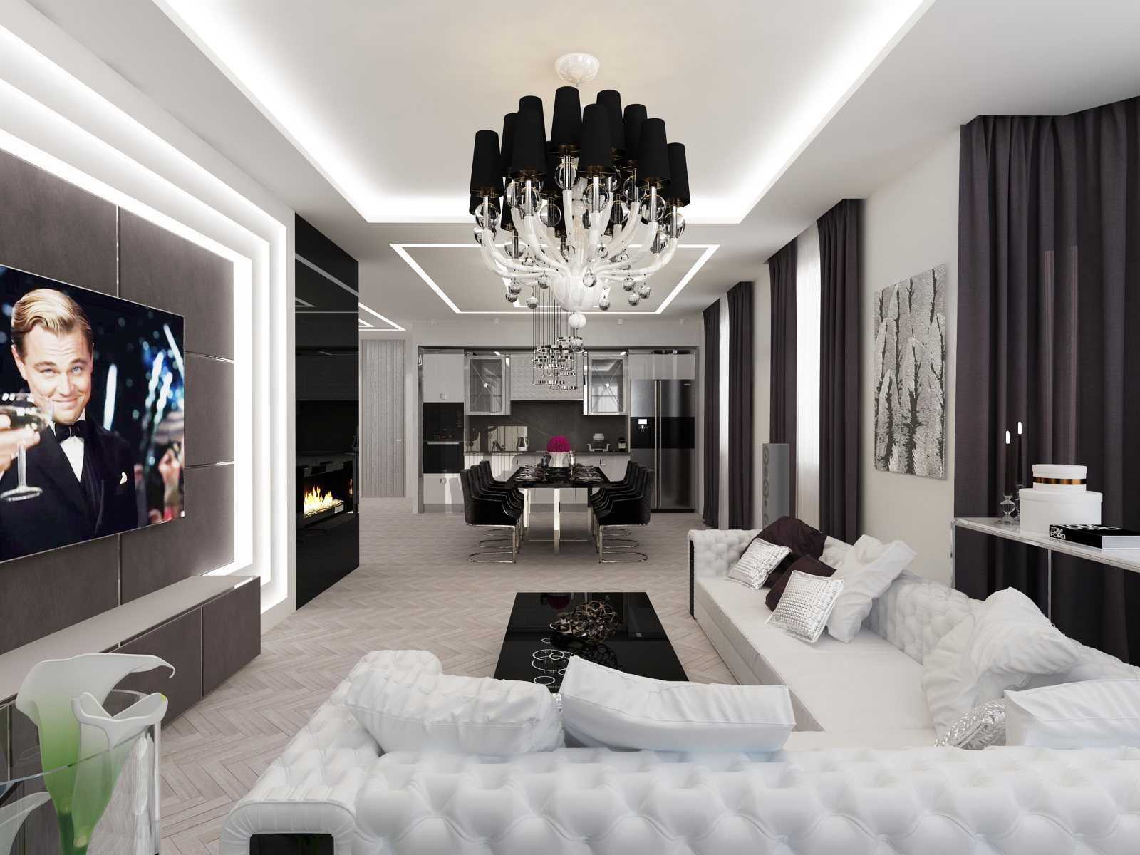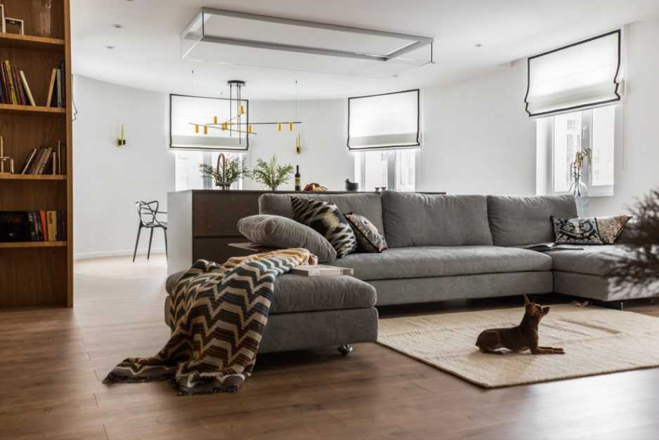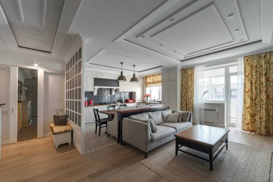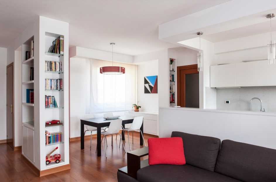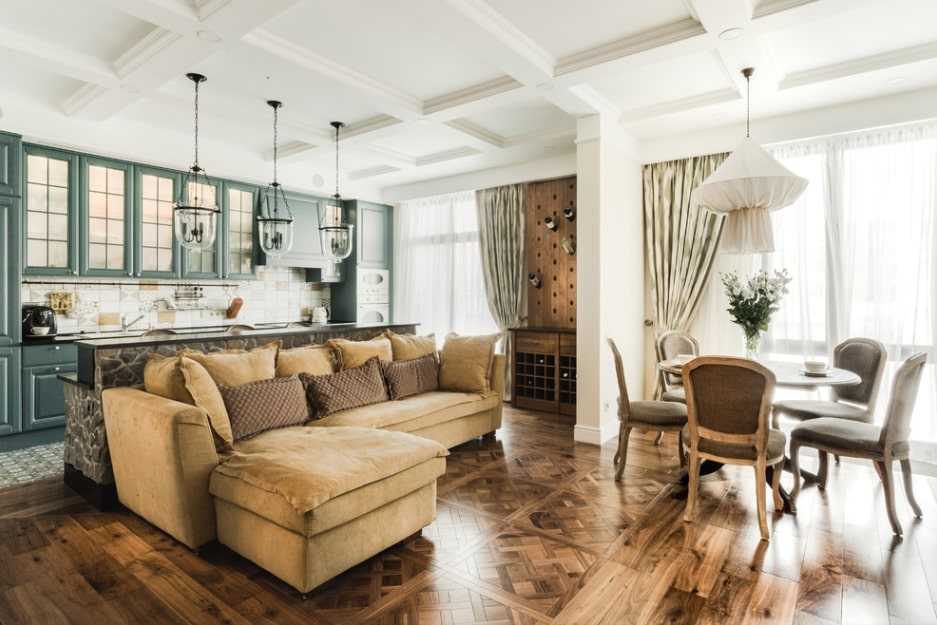 На больших площадях значительно проще обустроить несколько функциональных зон — пространство позволяет. Обладатели современных типовых квартир нередко идут на совмещение кухни с большой комнатой.