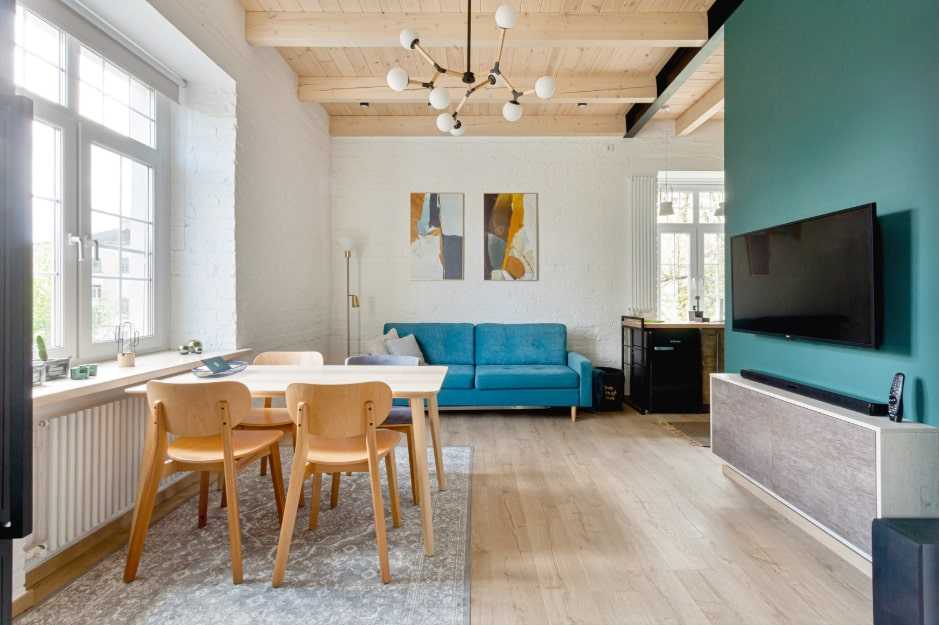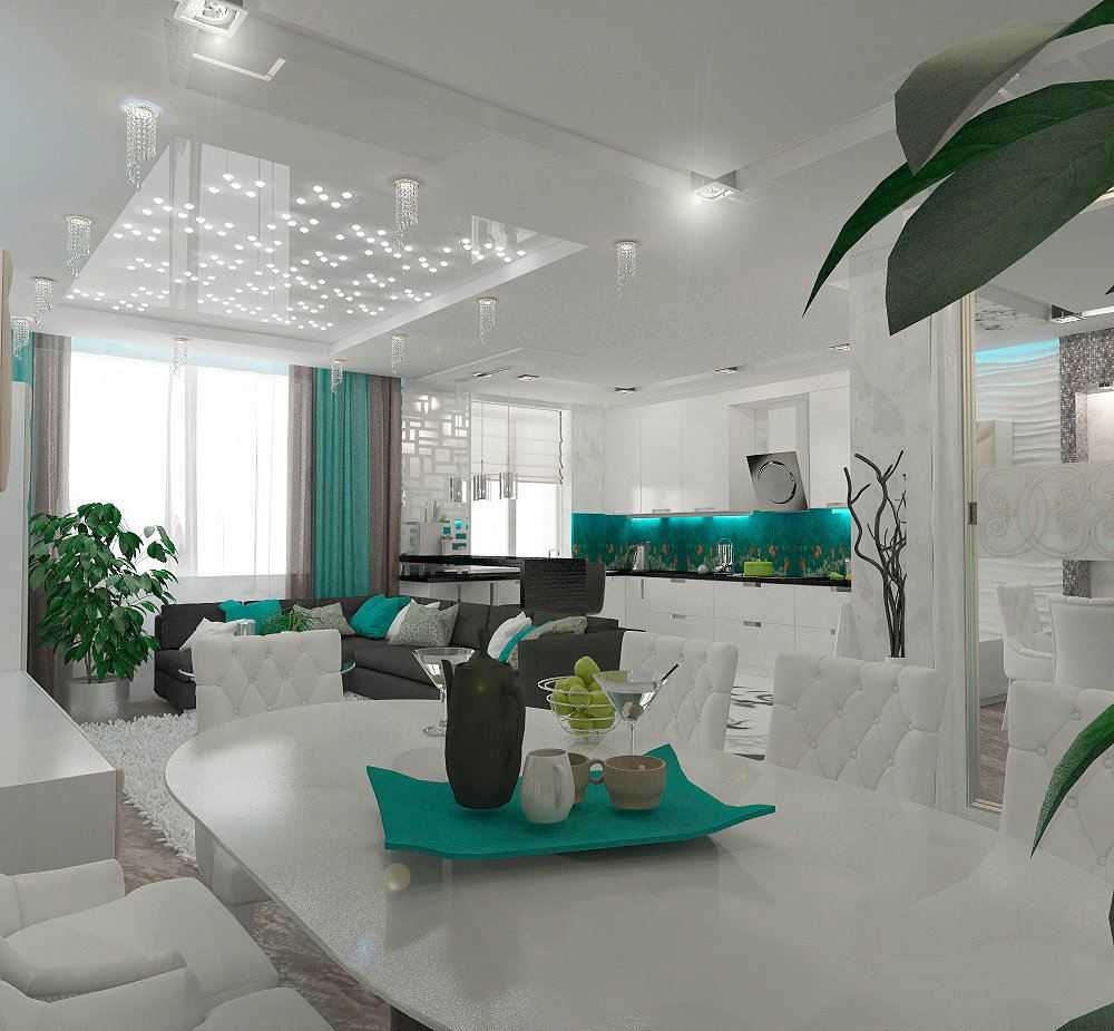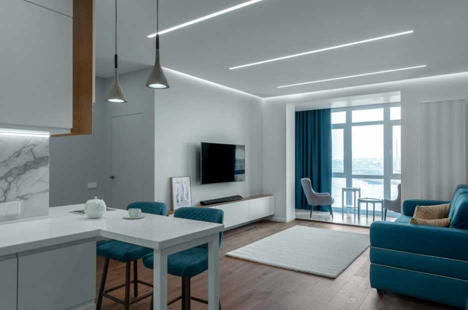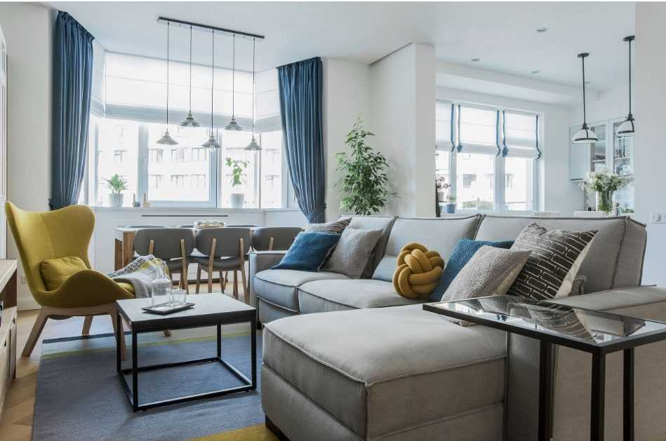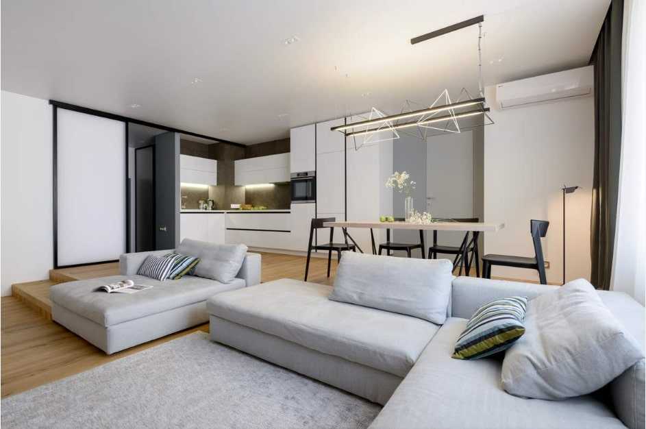 На больших площадях значительно проще обустроить несколько функциональных зон — пространство позволяет. Обладатели современных типовых квартир нередко идут на совмещение кухни с большой комнатой.