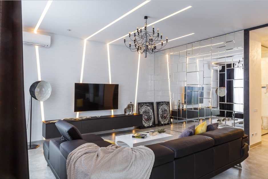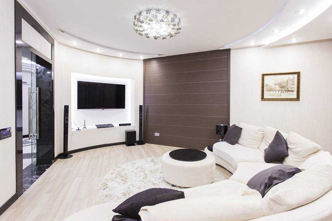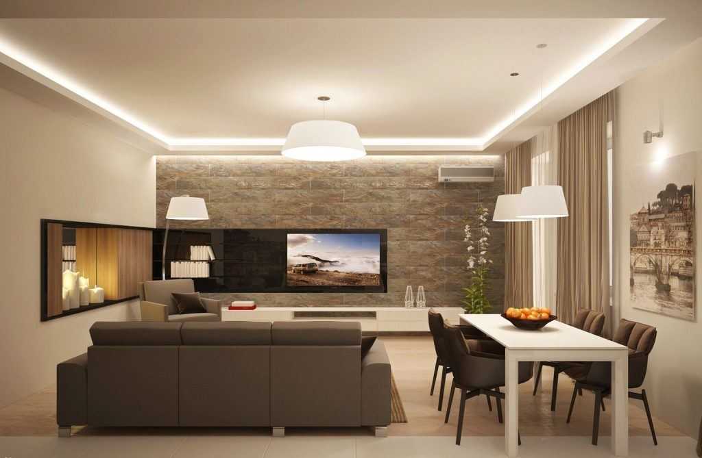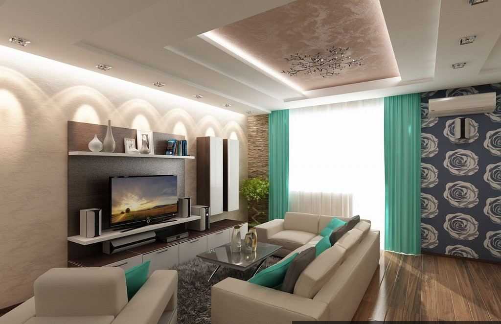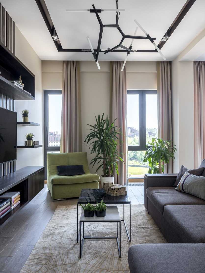 В дизайне гостиной потолок играет ключевую роль. Для отделки можно использовать самые простые варианты: